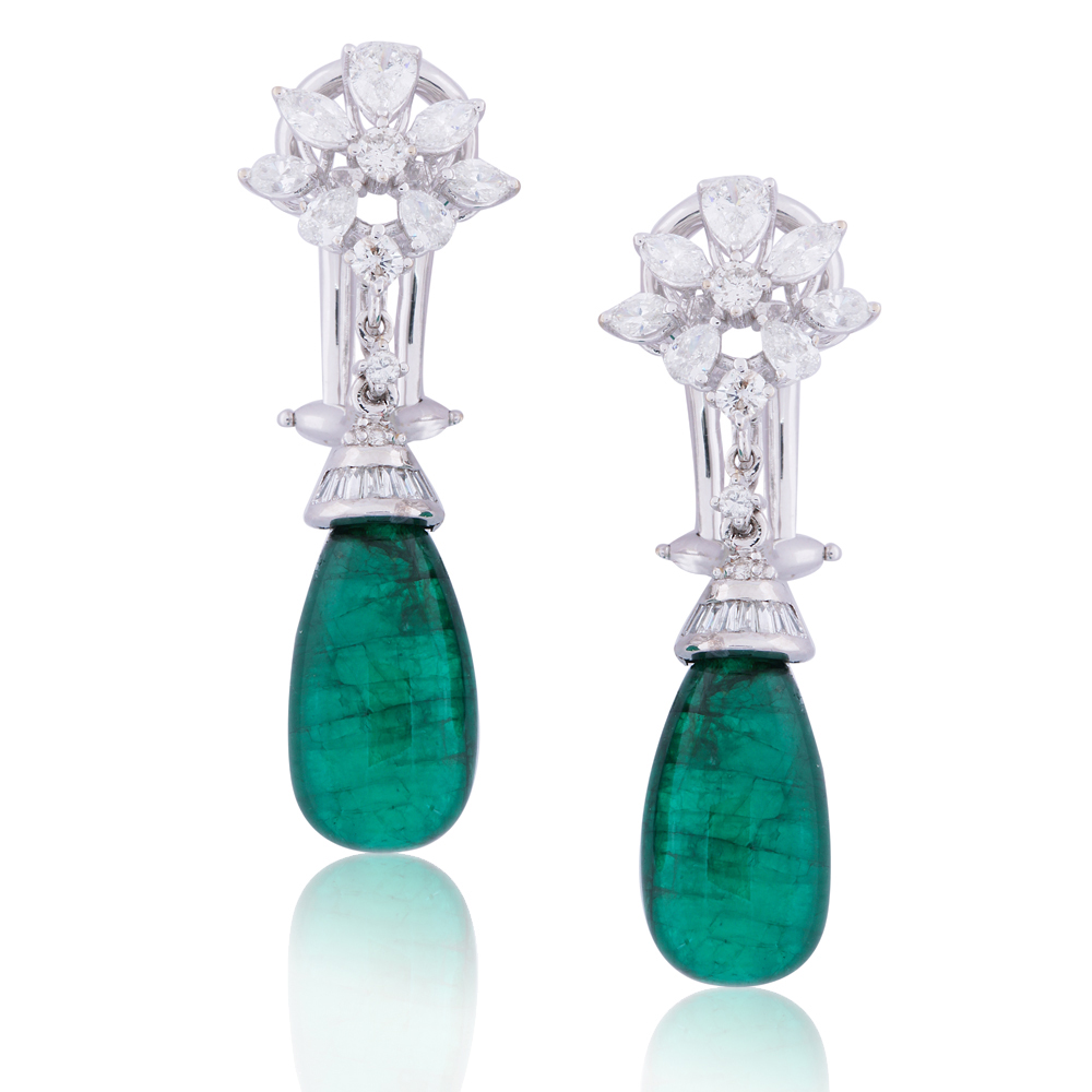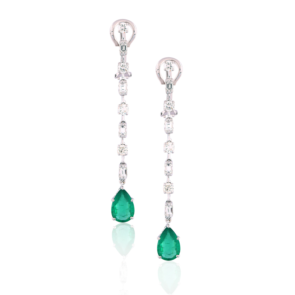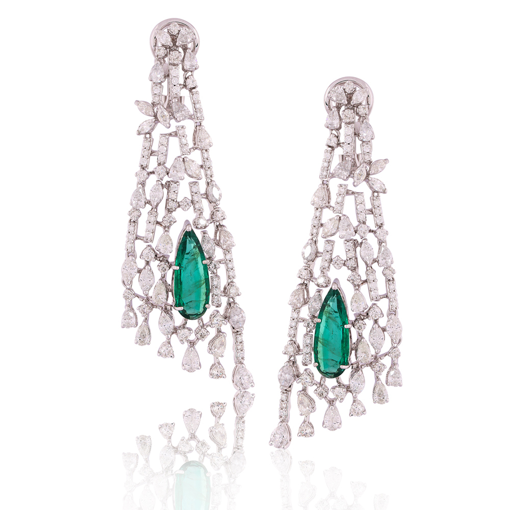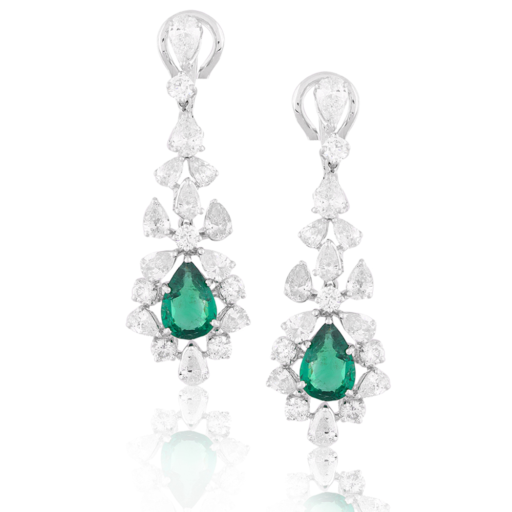 High quality pear shaped emeralds have been embedded between glistening diamonds to create a pair of uniquely chic earrings for the diva in you! The art of creating a masterpiece stems from an unwavering passion for excellence.