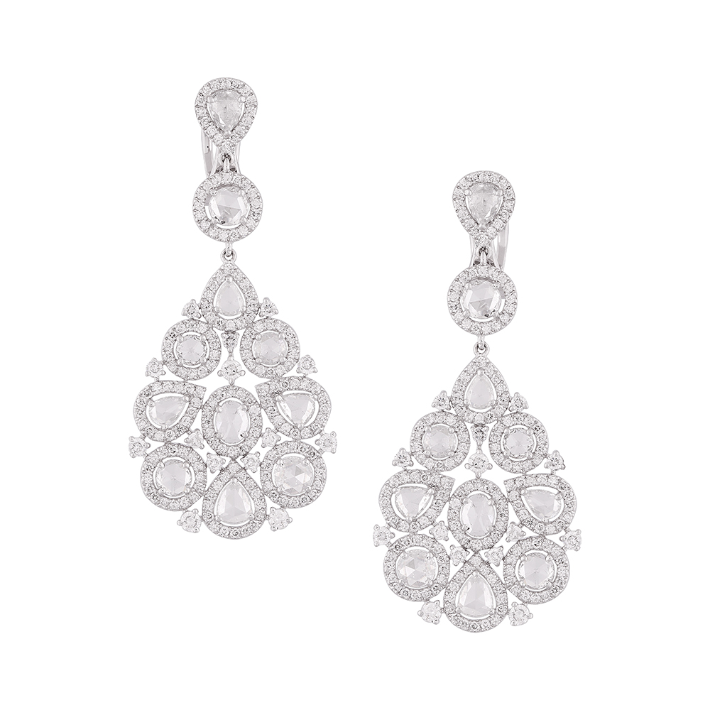 The vision of the designer is artistically carried out to perfection by trained artisans who meticulously shape the ornament and embed it with ethically sourced quality rose-cut diamonds. These earrings exude the charm of unadulterated magnificence.