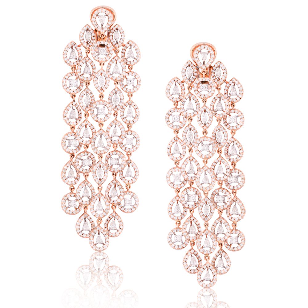 Designed to create a crescendo of gleaming diamonds, these ornaments draw inspiration from the filigrees of Taj Mahal. Certified quality stones have been meticulously placed in precious rose gold metal and are a testimony to the craftsmanship and eye-for-detailing.